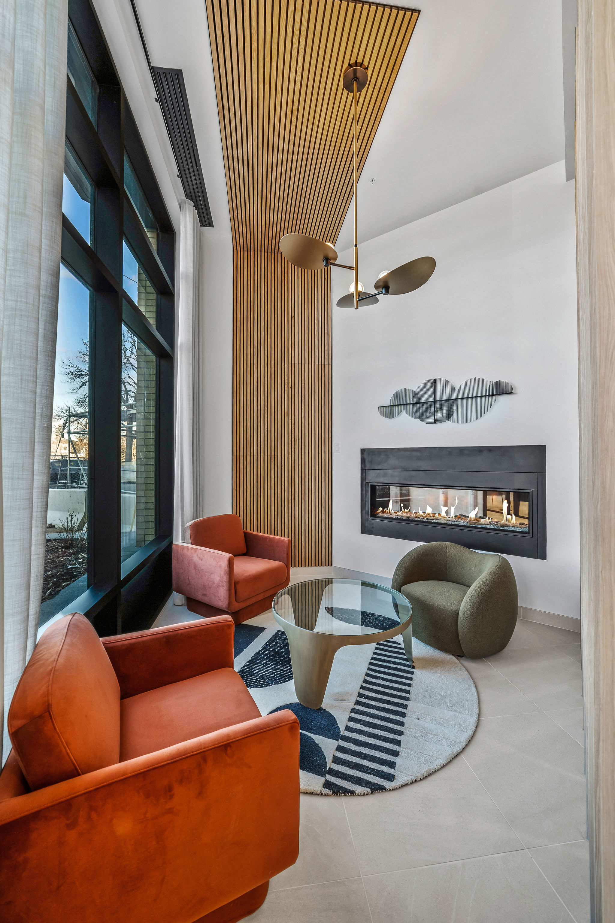 A warm, hotel-inspired arrival space with plush seating, a double-sided fireplace, and a feature art installation that sets the tone for elevated living.